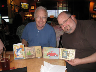 The 2 best Dads in all the world - my own Dad, and my little girl's Dad. They're showing off the cards they got for Father's Day. I made the dolphin card for my Dad, and the cute little skull card for Jared. Doesn't every man want a skull card? I think so. My mom-in-law, Lucy, made the canoe card, and the car card. She's quite the card crafter, ya know. Can you say "car card crafter" 3 times really fast? It was a lovely - uh, I mean manly day, and we showered the men with sushi gift certificates. You can never have too much sushi. So says my dear hubby.